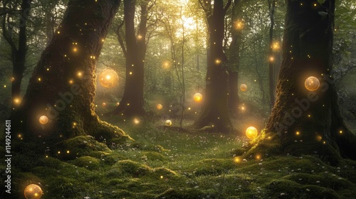 Enchanting Golden Orb Fairy Lights Illuminate Mystical Forest at Sunset - Fantasy Nature Scene