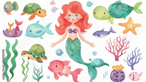 Enchanting handdrawn mermaid artwork featuring vibrant fish and turtles, perfect for adding charm to any room.