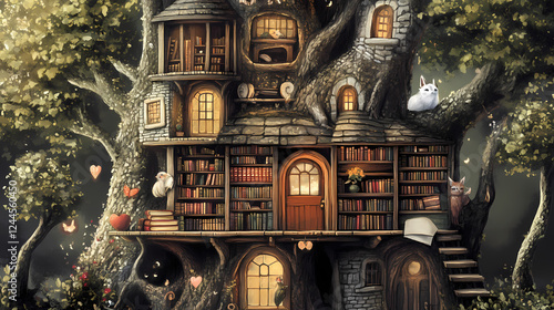 Enchanting library treehouse with magical creatures. Hidden Worlds. Illustration