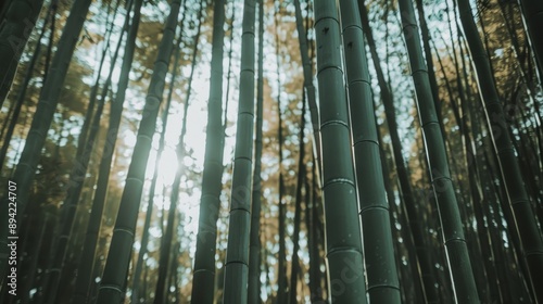 "Enchanting Low Angle Shot of Lush Bamboo Forest with Sunlight Filtering Through Trees"