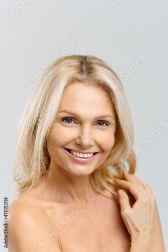 Enchanting middle-aged woman with blonde hair hug herself and look at the camera over grey background, mature lady smiles widely, has clear skin, fine wrinkles near eyes, vertical portrait