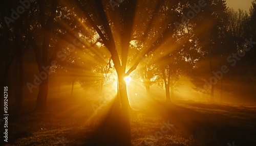Enchanting misty forest at dawn, bathed in warm golden light from the rising sun