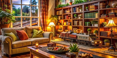 Enchanting Model Train Set in a Cozy Living Room with Warm Lighting and Inviting Decor, Perfect for Capturing the Art of Nostalgia and Home Comforts in a Relaxing Environment