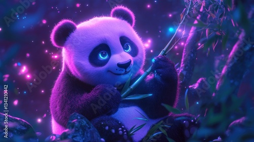 Enchanting neon panda savoring luminous bamboo in ethereal glowing forest