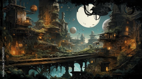 Enchanting night in city with celestial bodies ai generated 2D cartoon illustration