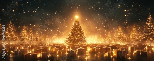 Enchanting night scene with glowing Christmas trees and golden gift boxes on a dark magical winter landscape