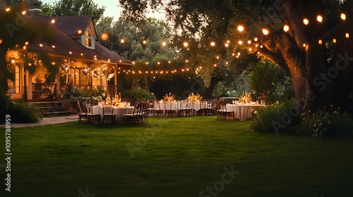 Enchanting outdoor evening event with elegant tables and string lights.