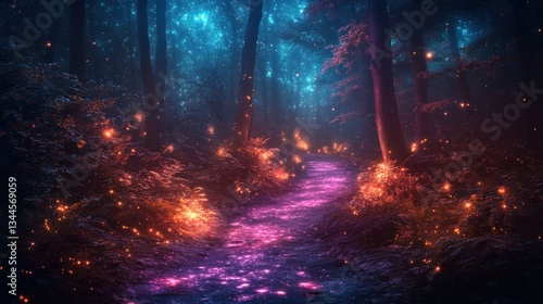 Enchanting path in a mystical forest at night, illuminated by glowing flora.
