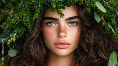 Enchanting portrait of a young woman surrounded by greenery nature scene close-up soft lighting beauty concept