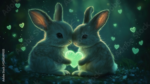 Enchanting rabbits holding glowing heart in magical forest setting