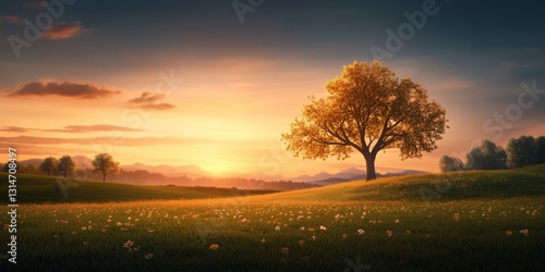 Enchanting spring sunrise overlooking a tranquil landscape with blooming flowers and a solitary tree