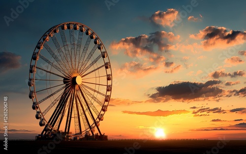 Enchanting Sunset Over a Ferris Wheel at Dusk by the Sea with Colorful Clouds in the Sky