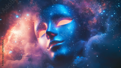 Enchanting surreal portrait of a cosmic masked figure set against a vibrant glowing backdrop of shimmering stars nebulae and ethereal cosmic atmosphere. Glowing Ethereal Masks. Illustration