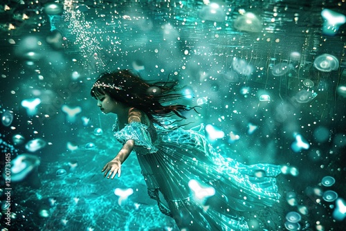 Enchanting underwater scene with mystical light and serene floating figure