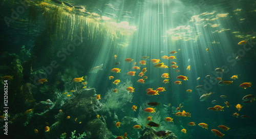 Enchanting Underwater World with Sunlit Tropical Fish and Vibrant Coral Reefs