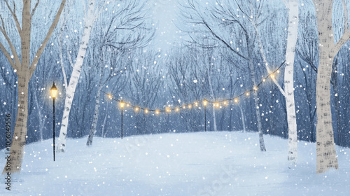 Enchanting Winter Pathway Illuminated by Warm Lights Nestled Among Snowy Trees