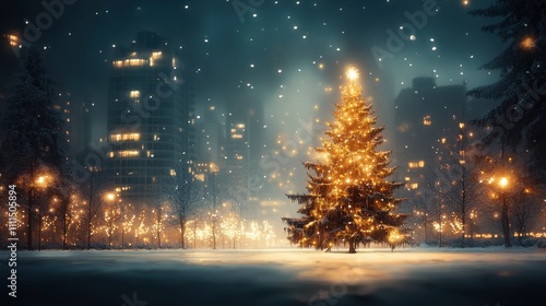 Enchanting winter wonderland featuring a glowing christmas tree in an ice castle city park holiday season snowy night magical atmosphere for festive celebrations