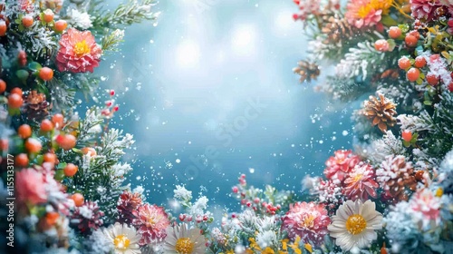 Enchanting Winter Wonderland with Colorful Flowers and Frosty Accents Framing a Magical Scene, Perfect for Holiday and Seasonal Themes