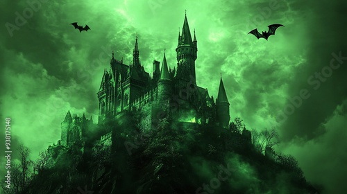 Enchantingly Haunted Gothic Castle on Hill Glowing with Eerie Green Light, Bats Flying - Spooky Fantasy Landscape