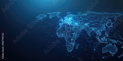 Encrypted data is transferred between global servers, demonstrating cyber protection alongside a digital world map in blue hues.