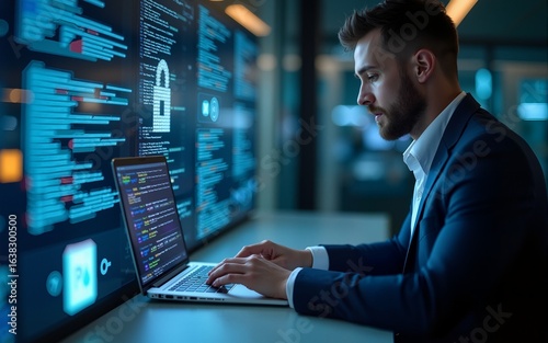 Encryption key management and secure document storage system. File data encryption and access control. Businessman using laptop computer. High quality