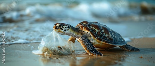 Endangered Sea Turtle Trapped in Plastic Bag on Pristine Beach – Environmental Pollution and Marine Life Conservation Concept