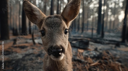 Endangered species affected by fire and climate change concept. A curious young deer in a burnt forest landscape.