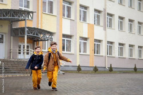 ended lessons.. funny boys with backpacks run from school
