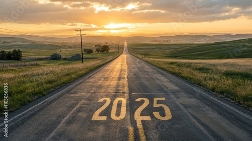 Endless highway under golden skies, with 2025 painted in bold letters leading to a hopeful sunrise.