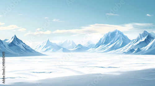 Endless icy plains with distant mountains - serene arctic landscape showing an ice-covered expanse leading to distant snow-laden mountains. Frozen Tundra. Illustration