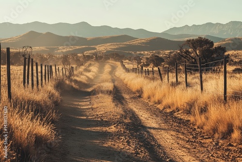 Endless outback dirt road with faded fence and mountains