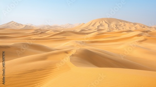 Endless sand dunes, shaped by the whims of the wind, stretch out under a golden sun, creating a mesmerizing desert panorama