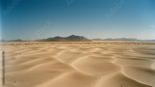 Endless sand dunes stretch across a sunlit desert, with majestic mountains in the distance, embodying vastness and timelessness.
