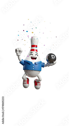 Energetic and joyful bowling pin character celebrating a strike with a black bowling ball in hand surrounded by colorful confetti and white splash on