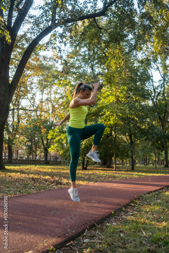 Energetic and strong athletic mature woman running in place in park. Pursuit of fit physique and commitment to healthy lifestyle with outdoor workout and training. Vigorous