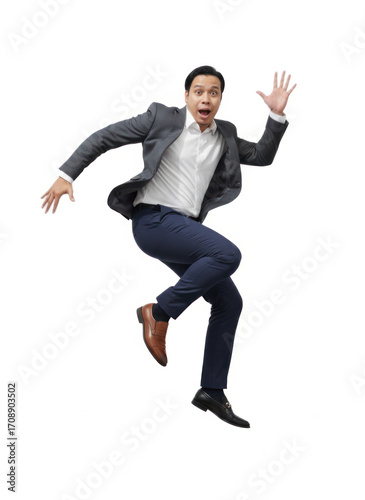 Energetic Asian businessman in a suit jumps with an excited, surprised expression, symbolizing triumph, success, and dynamic achievement. Ideal for business concepts.