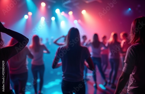 Energetic crowd dancing in brightly lit club at night. People move with vibrant energy. Nightclub atmosphere lively. Dancing group enjoy music. Event full of festivity. Nightlife celebration in