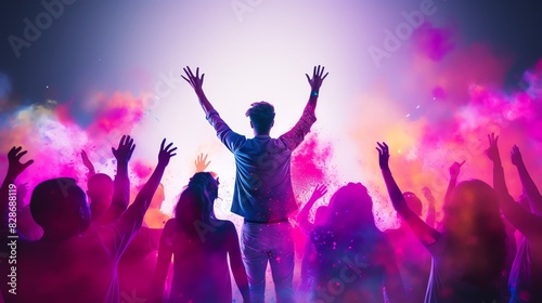 Energetic crowd with vibrant colors and raised hands at a festival or concert. Celebratory atmosphere with bright lighting and colorful smoke.