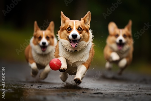 Energetic dogs running after a ball on a sunny day, Two Welsh corgi dogs running with a ball, AI generated