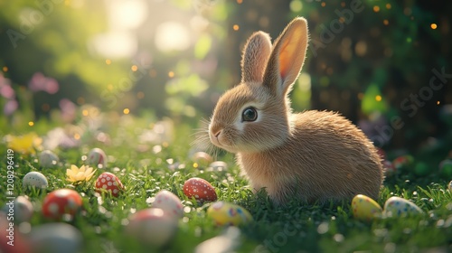 Energetic easter bunny exploring vibrant spring meadow with colorful eggs