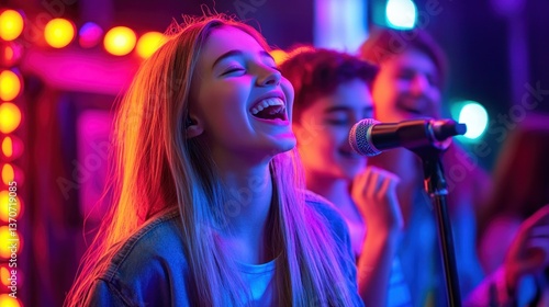 Energetic family karaoke night with vibrant neon lights creating a fun atmosphere