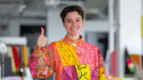Energetic Fashion Designer in Colorful Workshop Showing Approval with Thumbs Up amid Fabric Swatches and Sketches.