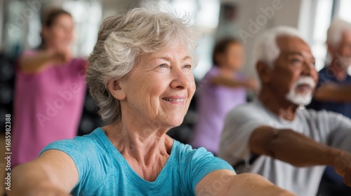 Energetic medium view of seniors engaged in seated aerobic exercises main subject in sharp relief emphasizing dedication amid softened group motion.