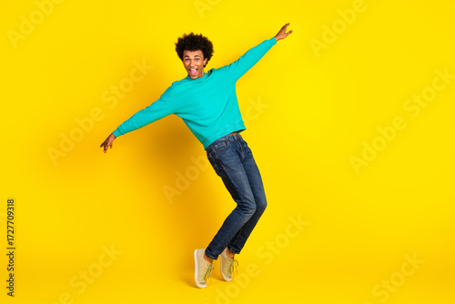 Energetic young man in a teal sweatshirt posing playfully against a vibrant yellow background expressing joy and style