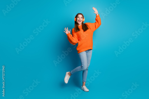 Energetic young woman in orange sweater smiling joyfully while posing against vivid blue background