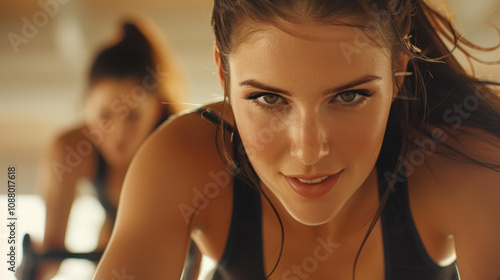 Energetic young women pedal hard in an exciting indoor cycling class, showcasing their fit and sporty lifestyle.