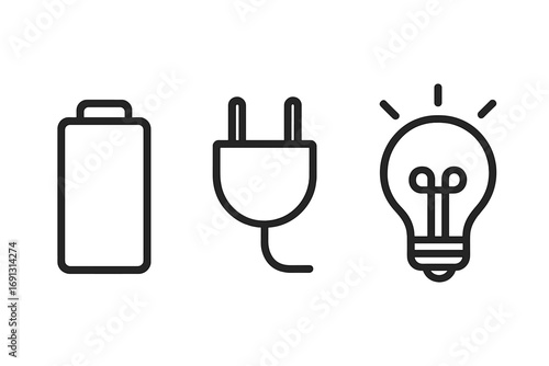 Energy and power icon set. Minimalist line art of battery, plug, and light bulb symbols. Vector graphic for electricity, charging, innovation, and creative idea concepts.