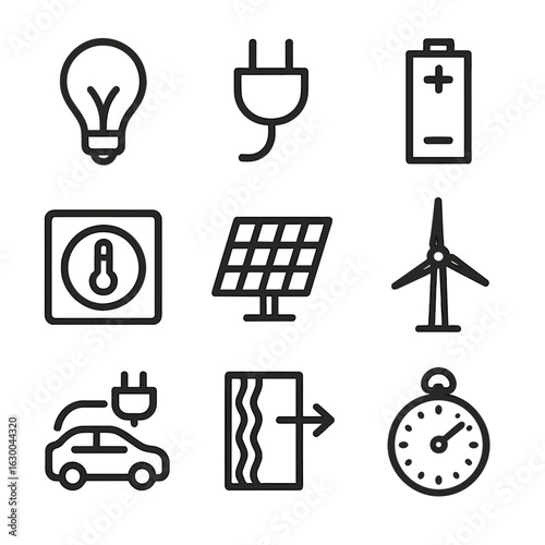 Energy Conservation Icons. Outline icon set of energy conservation: light bulb, power plug, battery, thermostat, solar panel, wind