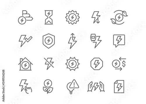 Energy in Lines Vector Set a set of line style vector icons reflecting the concept of energy, including lightning bolts, sockets, and light bulbs.