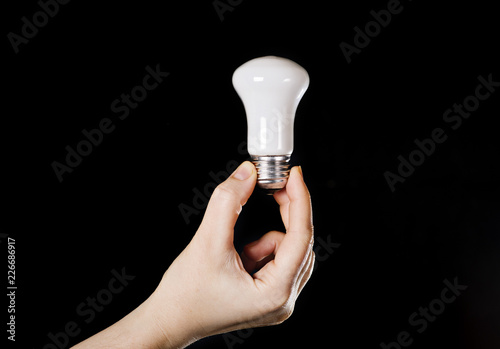 energy saving lamp in hands on a black background
